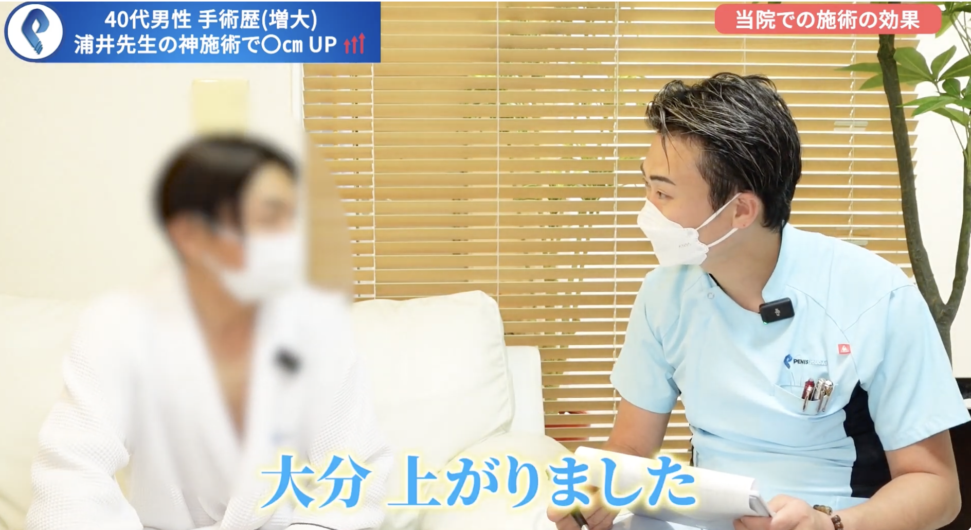 浦井院長今日のお客様は、40代の方で20回の施術を終わられました。今は40回のコース途中です。過去に別のクリニックで手術をしてから当院に来られました。今、40回のコース途中ですが、当院に来られてからペニス増大施術をして大きさや硬さなど効果はいかがですか?