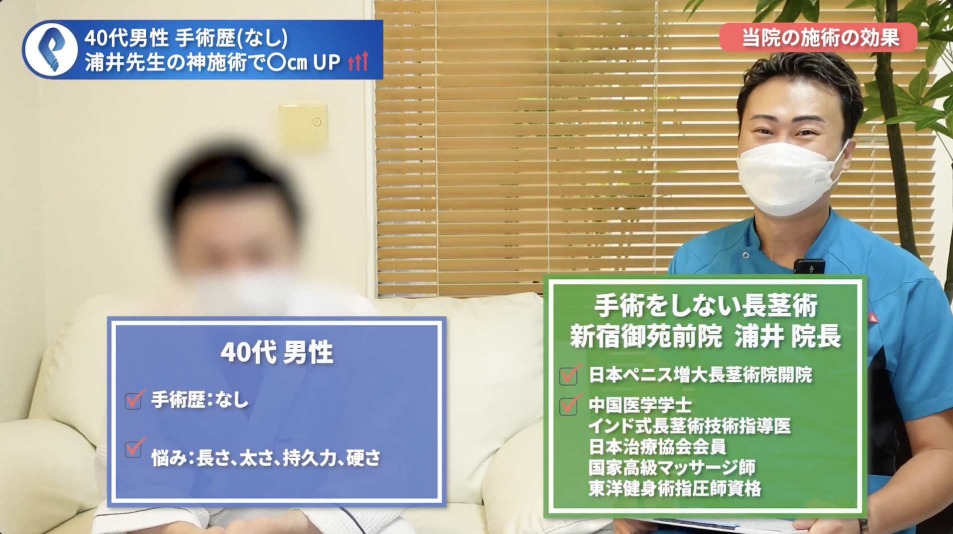 浦井院長今回は40代のお客様にインタビューしたいと思います。今までの施術の効果についてお話しをしていきます。当院に1〜2年ほど通っていただいているので、来院する目的はペニスを大きくすることですね。長さ・太さは大きくなった実感はありますか?