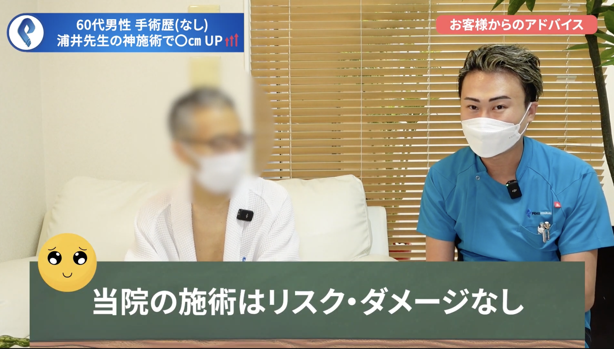 60代のお客様自然に大きくなるのが、身体にダメージがない施術なので危険も少ないと思うし、大きくなるだけではなく勃起力も強化されるので、手術よりも時間はかかりますが、自然に1番改善しやすいと思いますし、続ければ効果が必ず出ると私は思っています。