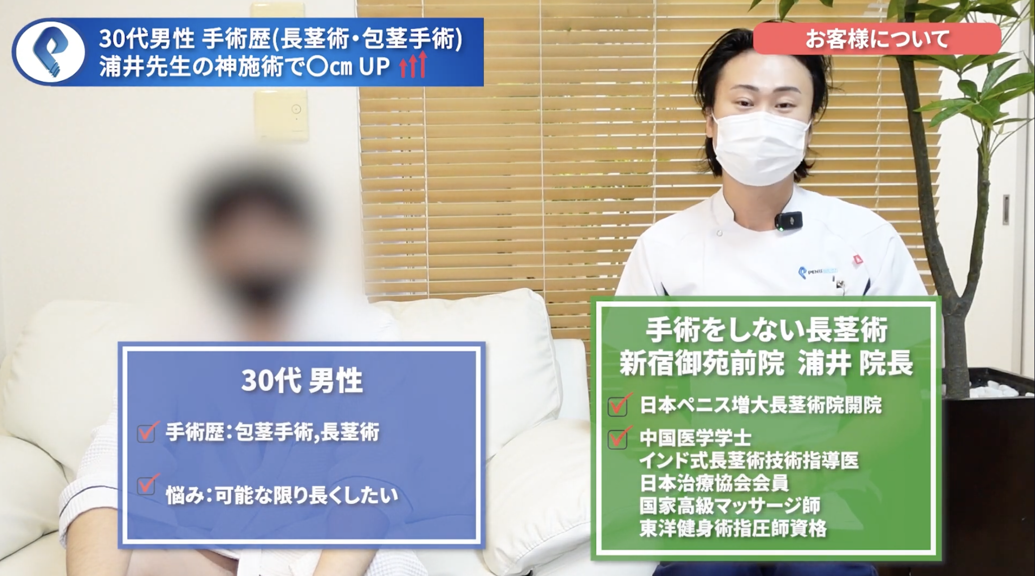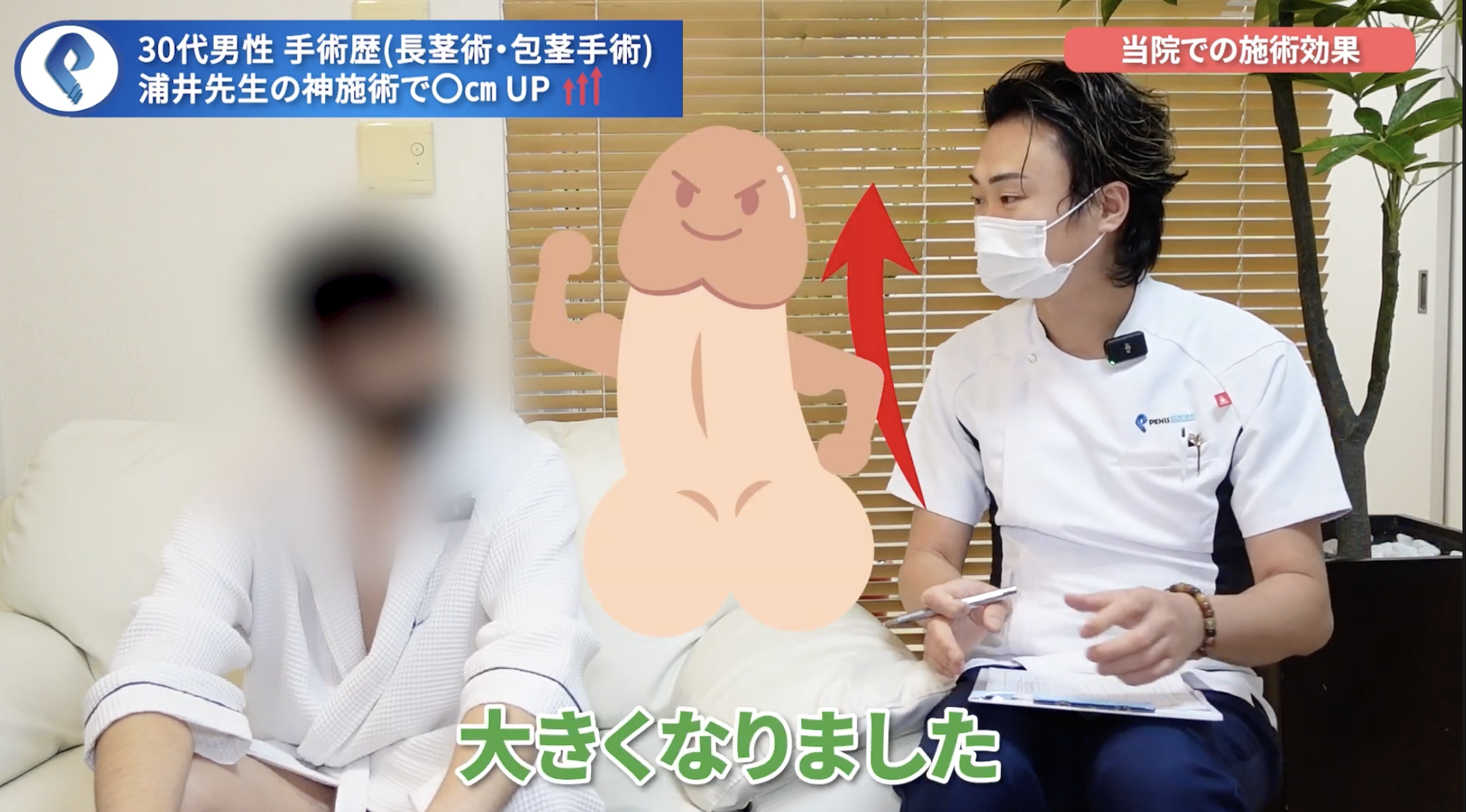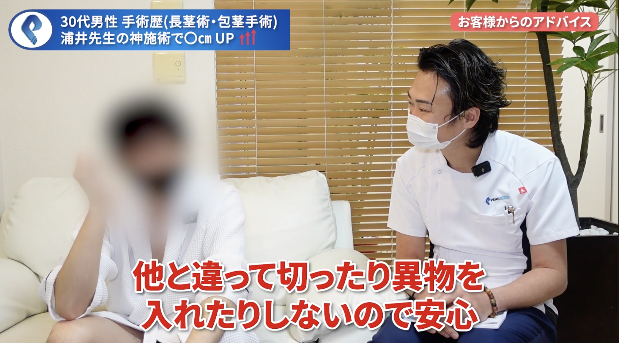 浦井院長今日はいつも通り、お客様の施術が終わりました。今までの感想や効果を説明します。隣の方は当院のお客様です。30代の方です。以前手術の経験があります。今日はご協力ありがとうございます。今までの効果をお話しします。前長と後長はサイズが変わりましたね。感覚はありますか?