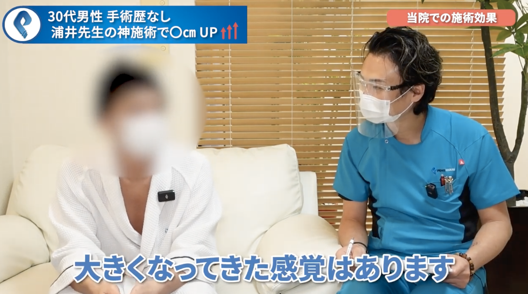 浦井院長30代で、40回コースを施術をしてます。効果は、前長(勃起しない時のサイズ)は、2.3㎝大きくなりました。後長(勃起した時のサイズ)は、2.5㎝以上です。今はまだ40回終わっていないのですが、2㎝以上ペニスが大きくなった感覚はありますか?